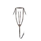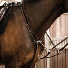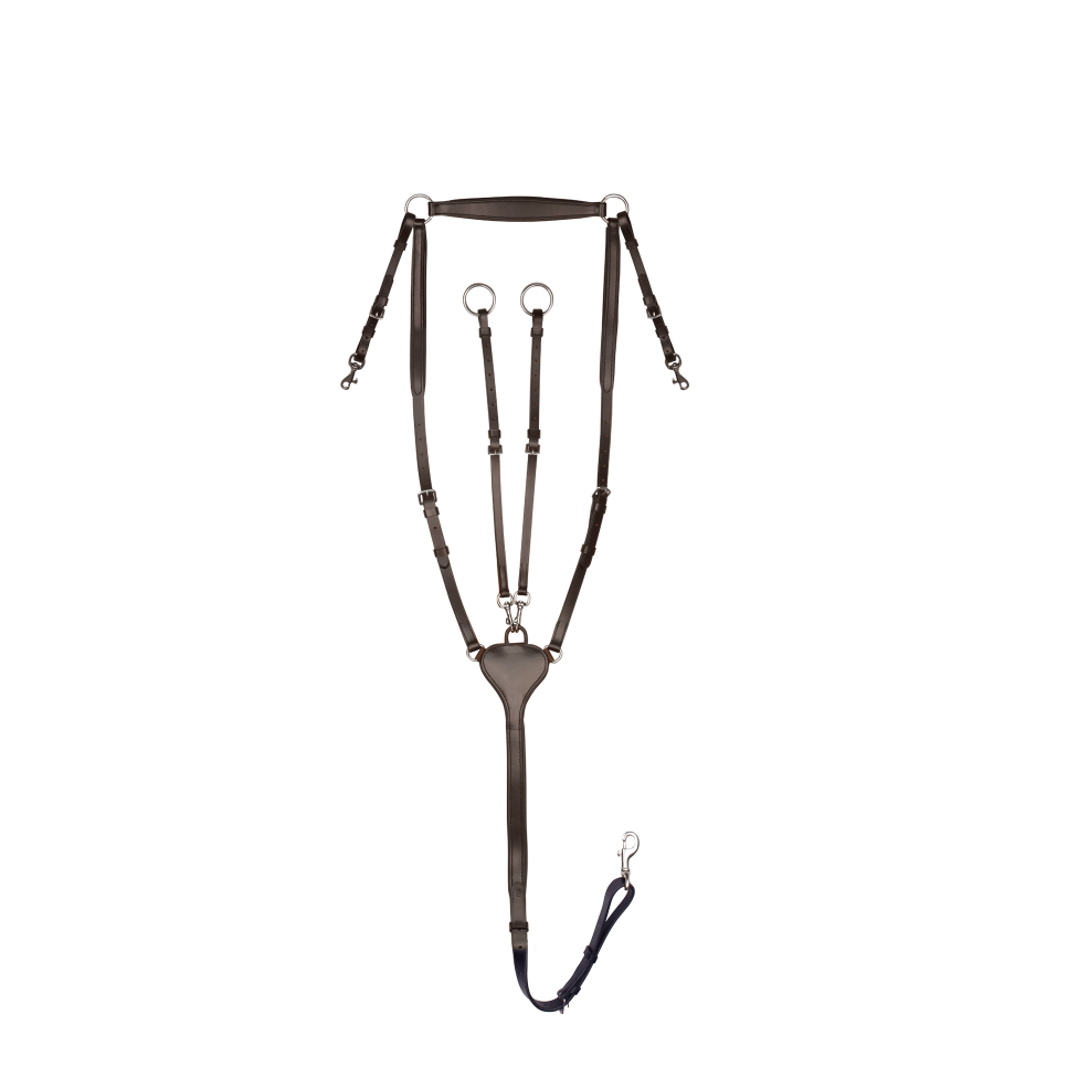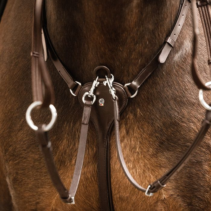 Pechopetral con puente de cuero suave que impide que la silla se pueda deslizar hacia atrás. El pechopetral se puede fijar a la silla y a la cincha con toda comodidad utilizando los mosquetones de carabina. Con suave acolchado en el pecho y en la cruz. Regulable en el tamaño, así como con horquilla de martingala de quita y pon. Con hebillas de acero inoxidable.