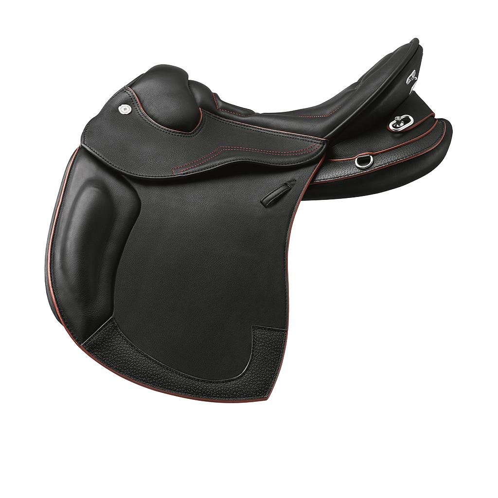 Una silla de montar monofalda con un aspecto atrevido y deportivo. Fabricada con costuras y ribetes rojos (también disponible tono sobre tono). Se puede solicitar un cuerno opcional. Su característica técnica más importante son los paneles flocados LPF (Light Performance Fit), que proporcionan una amplia superficie para garantizar una adaptabilidad óptima a las diferentes morfologías de los caballos.